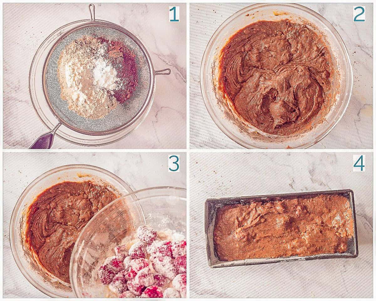 - Frambozen voorzichtig met beetje bloem mengen, overtollige bloem eraf schudden. Voorzichtig door beslag spatelen. Schenk in de vorm.