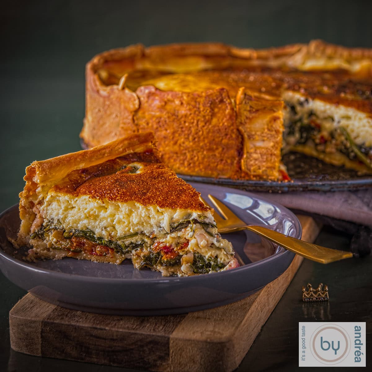 Een goede vervanging voor snijbiet is verse spinazie. Om het recept voor iedereen zo toegankelijk mogelijk te maken viel daar mijn keuze op. Door de spinazie te laten slinken kun je het prima gebruiken in een quiche of plaattaart. Omdat de vulling crème fraîche bevat, koos ik voor een hartig taartdeeg in plaats van het bladerdeeg. Dat kun je prima afbakken en is makkelijk in gebruik, maar het doet wat minder vet aan. En ik maakte er meer een Quiche van omdat wij hier met vijven zijn en de plaattaart dan te weinig is.