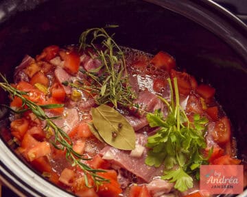 - Doe de tomaten, wijn en water in de slowcooker. Leg ook de tijm-, peterselie- en rozemarijntakjes erbij.2 tomaten, 3 takjes platte peterselie, 2 takjes verse tijm, 2 takjes verse rozemarijn, 250 ml water